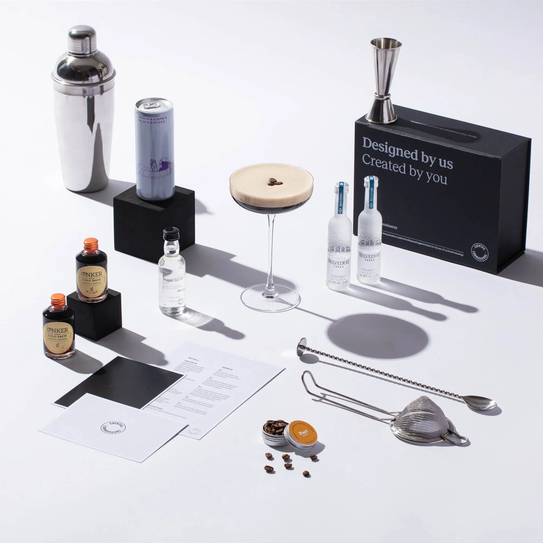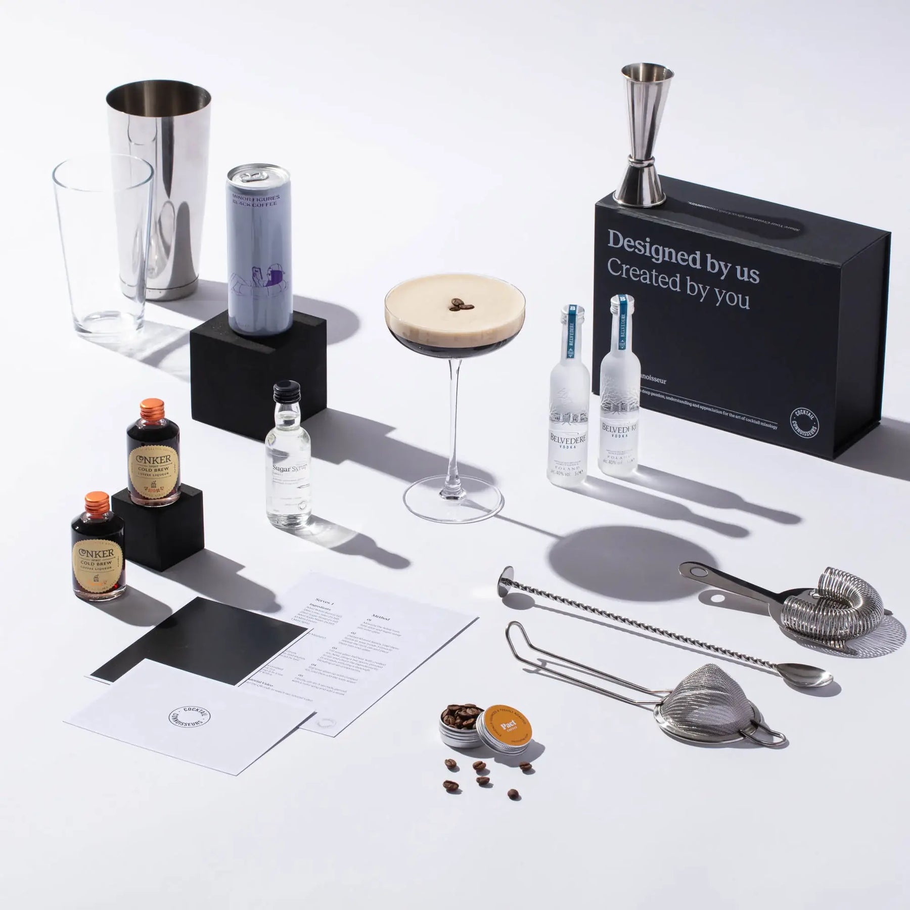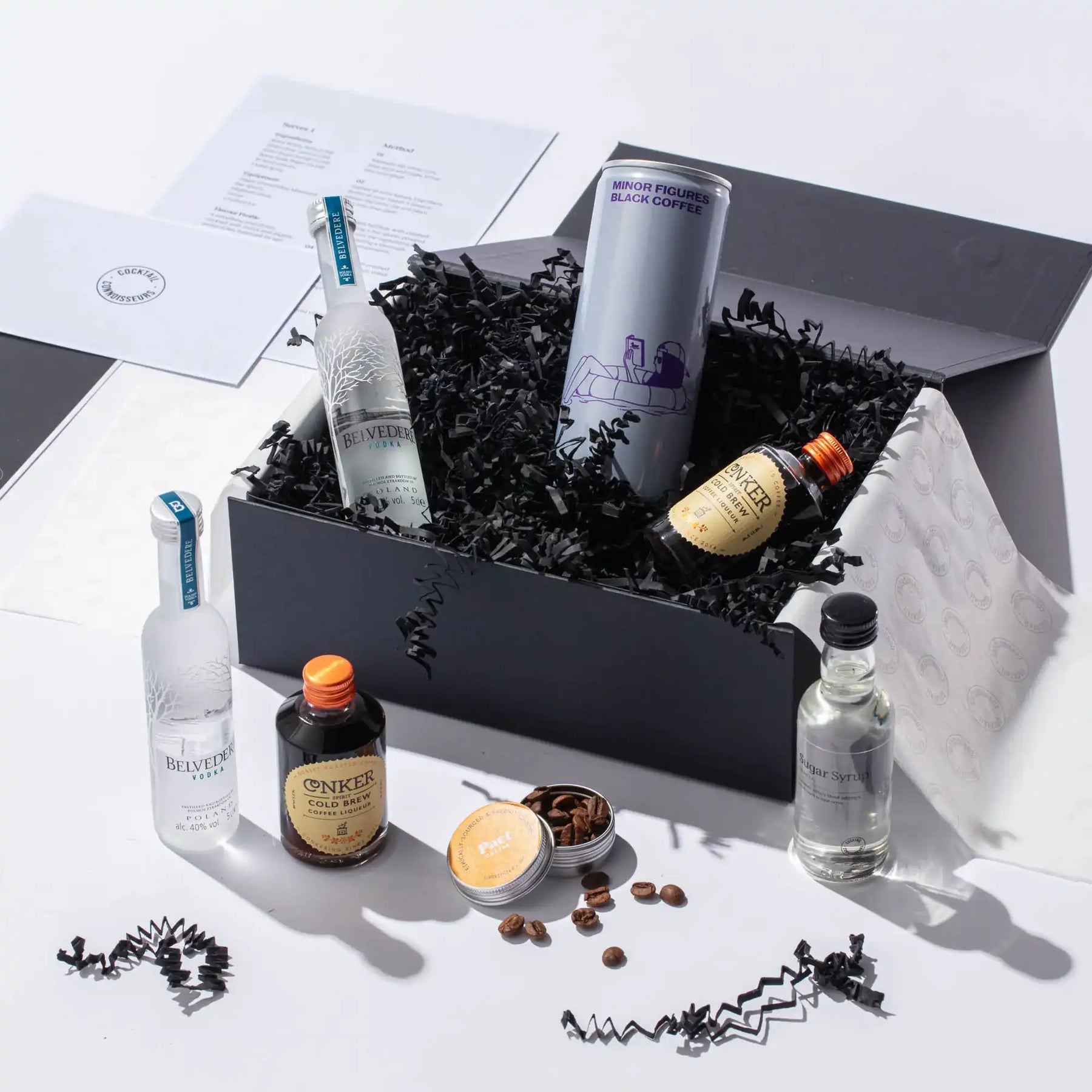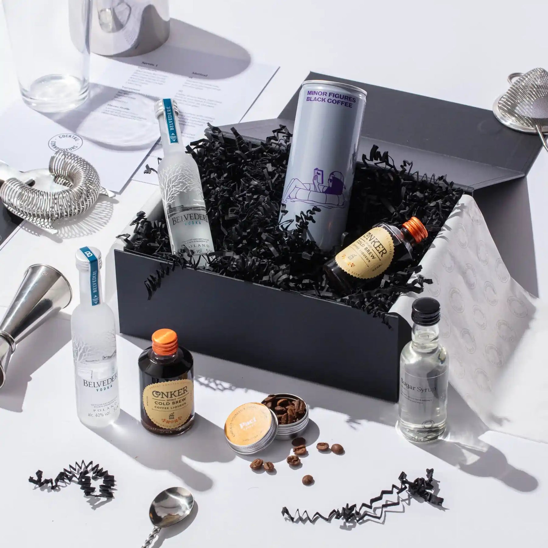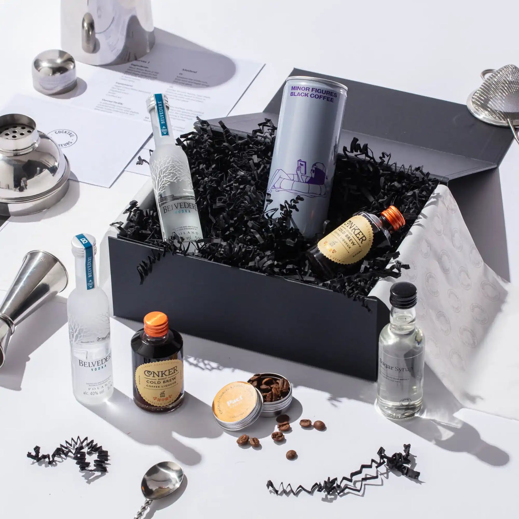 Introducing our exclusive Espresso Martini Gift Set. Unleash your inner mixologist with this captivating experience. Featuring premium Belvedere Vodka, Cold Brew Coffee Liqueur, bold Coffee, sweetened to perfection with sugar syrup and finished with a sprinkle of coffee beans. Includes a step-by-step recipe card and an immersive tutorial video, all presented in a stunning gift box. Order your Espresso Martini Kit today and start mixing!