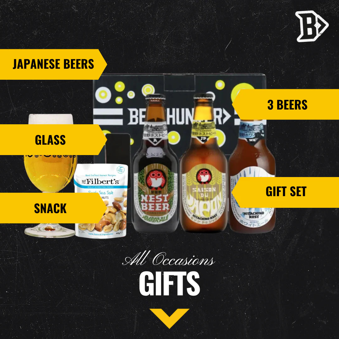 This 3-pack gift set includes Hitachino Nest Japanese Mixed Beer and Beerhunter glass. Brewed in Japan since 1823 by Kiuchi Brewery, the original beer is crafted with a combination of brewing heritage, passion, and intuition. Enjoy Amber Ale, Saison Du Japon, and White Ale, along with a stylish glass and gourmet snack.