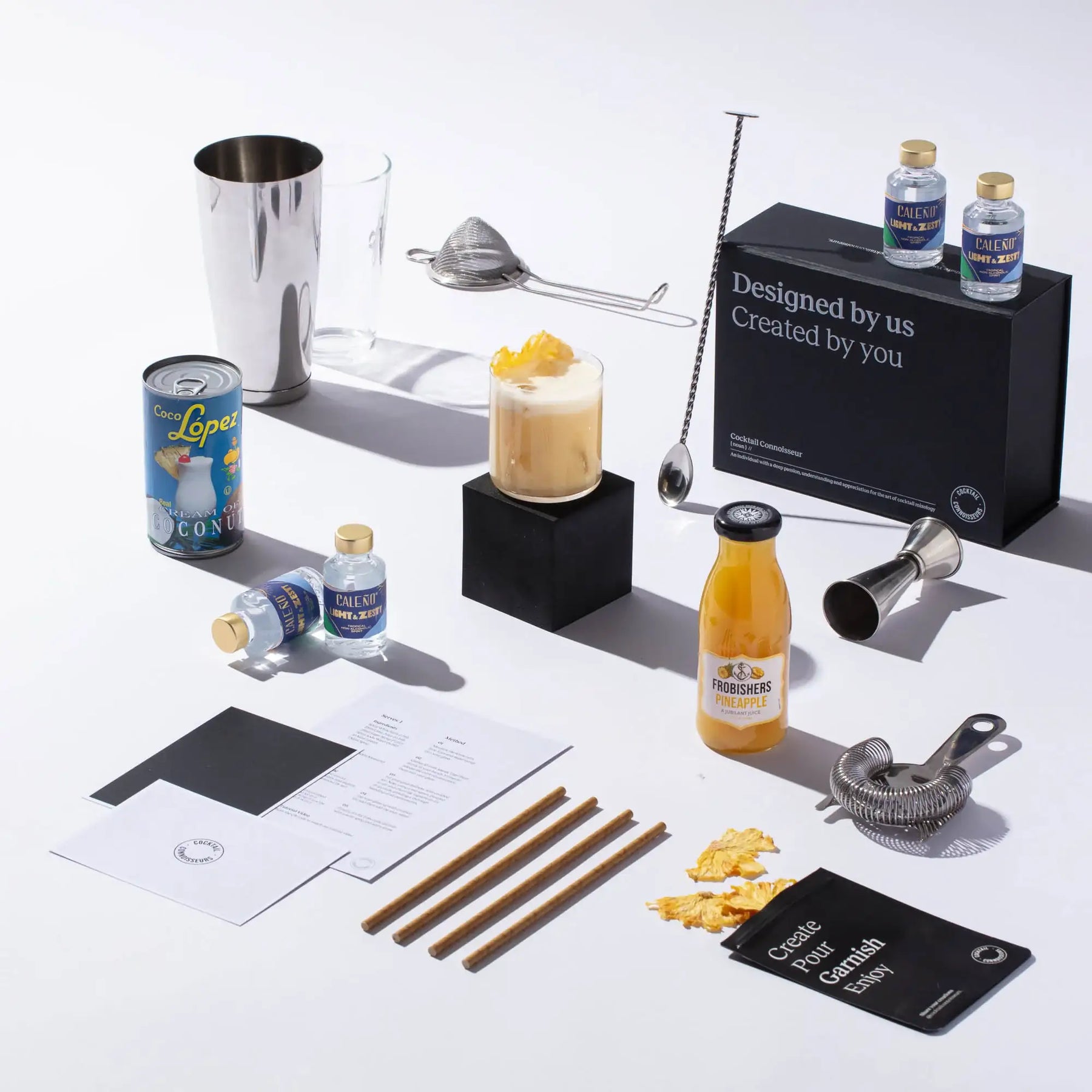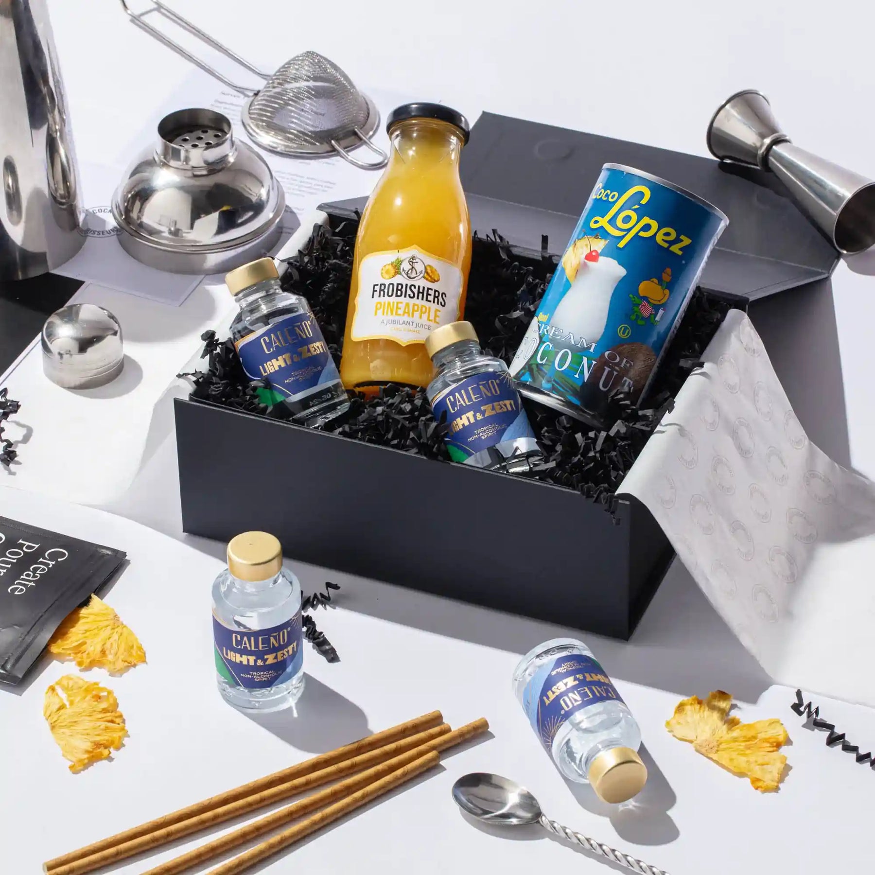Discover our non-alcoholic Piña Colada cocktail making kit, the perfect gift set for cocktail enthusiasts. Craft 4 bar-quality cocktails at home with premium non-alcoholic spirits, mixers, syrups, juices, garnishes, recipe cards and tutorial videos - all packaged in an elegant presentation box and delivered to your doorstep. Elevate your experience by choosing our 2-in-1 cocktail kit with bar equipment sets. Order your non-alcoholic Piña Colada cocktail kit today!