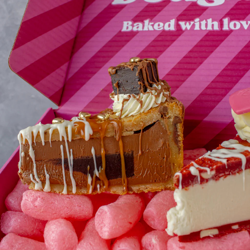 This box includes three Cookie Pie Slices — Valentine’s Red Velvet, Valentine’s Jammy Dodger and Valentine's Salted Caramel Brownie — plus a Valentine's Red Velvet Deluxe Cookie, a Valentine's Ruby Chocolate Cookie, and a Valentine's DoughGirl Brookie Slab.