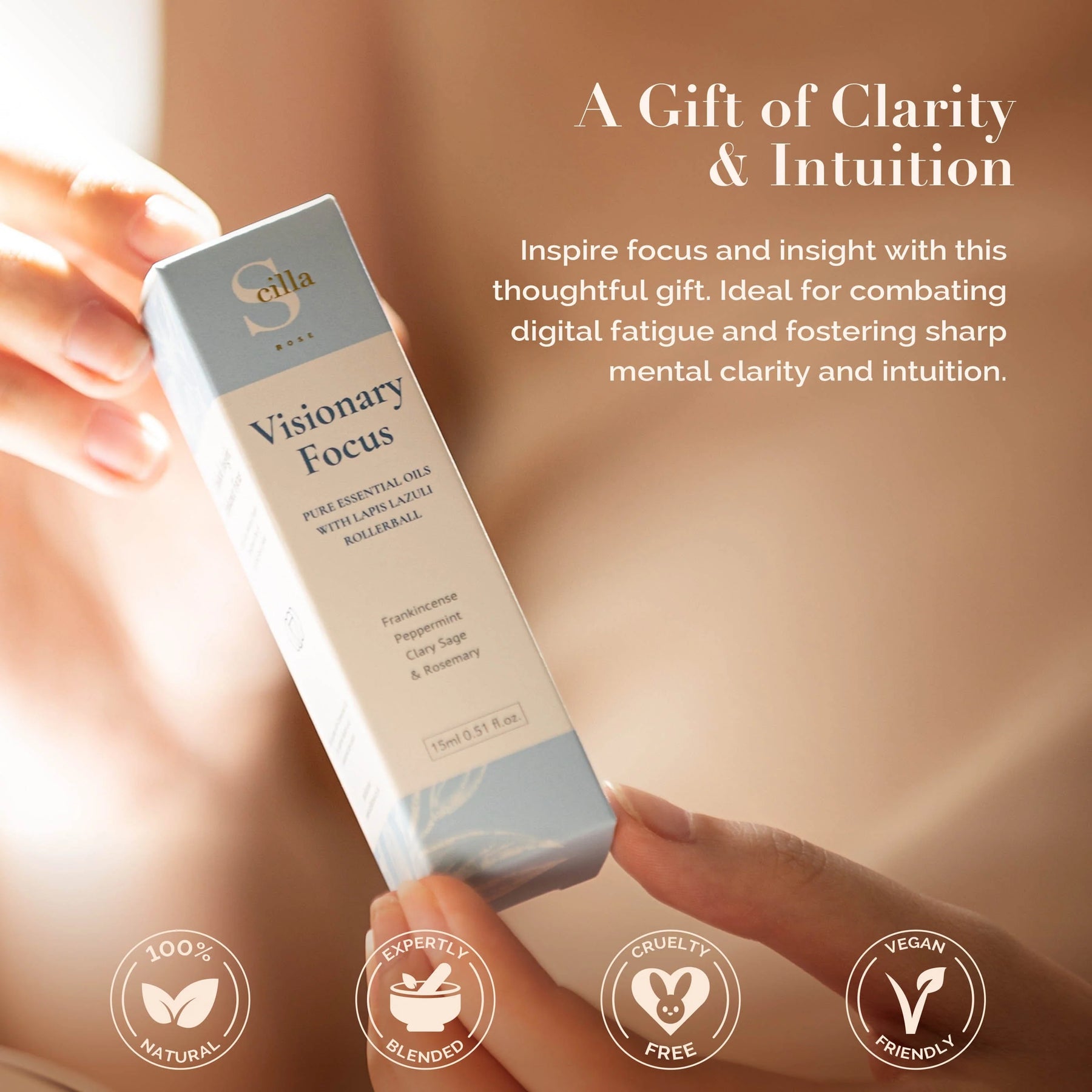 At Scilla Rose, we are devoted to empowering individuals to prioritise self-care and cultivate a mindful life 💖. Our 7 Chakra Collection, crafted with love and intention, is designed to support modern wellness needs, such as focus, mental clarity, and relief from digital fatigue. Visionary Focus is part of this collection, supporting the Third Eye Chakra to promote intuitive wisdom, focus, and mental clarity. Embrace a daily ritual that nourishes your mind, body, and soul, and join us in celebrating mindfulness and wellness. Ideal for birthdays, Christmas gifting 🎄, or as a thoughtful tool for personal growth, each rollerball in our collection is a meaningful gift for yourself or others.