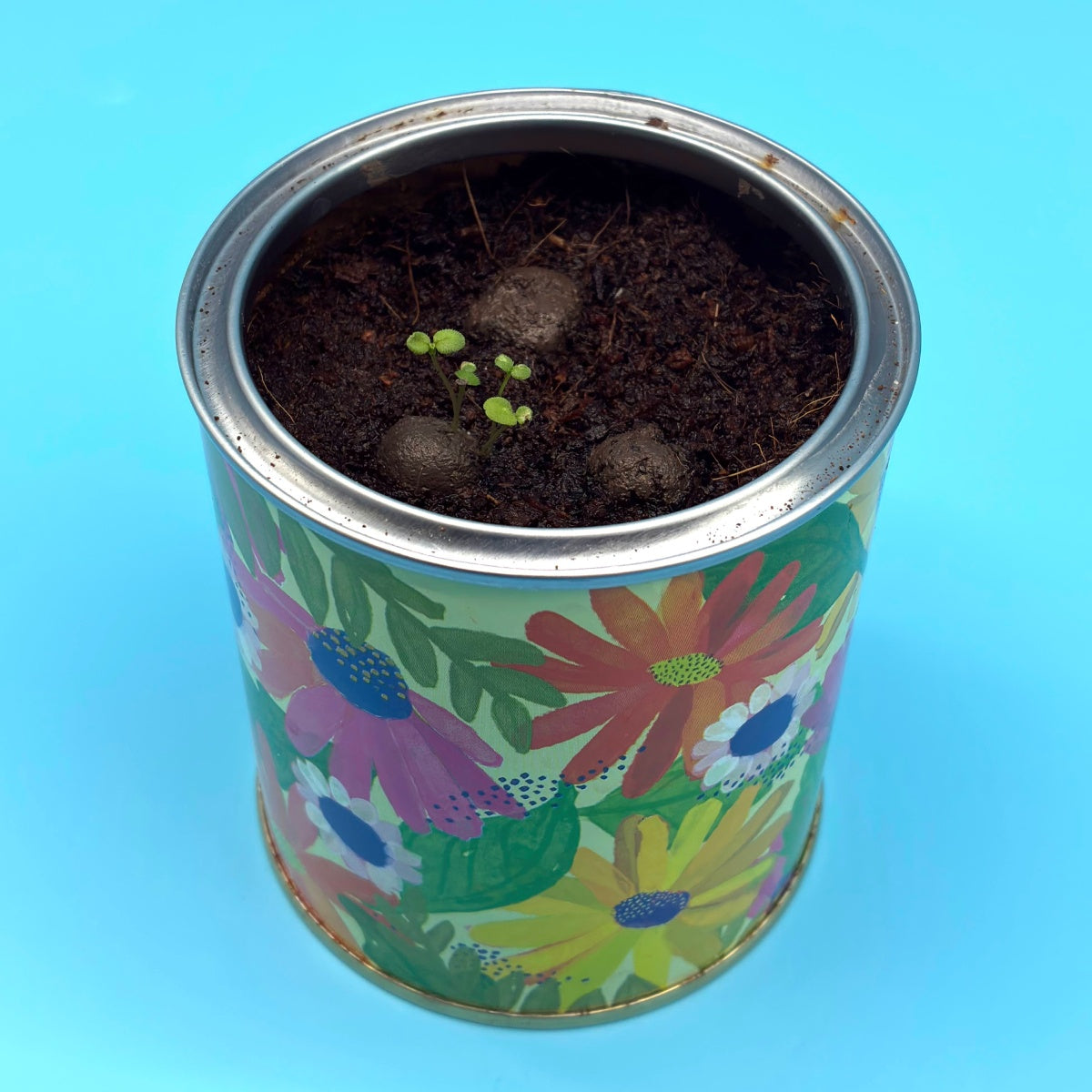 Inside you’ll find a peat-free coir disc made from coconut husk, a renewable by-product of the coconut industry. Just add water and it expands into rich compost. Pop the three seedballs (around 90 seeds in total) on top, keep everything well watered (moist, not soggy), and place the tin outdoors or on a sunny windowsill. Thanks to a special protective varnish, the tin is suitable for outdoor use — and with a little patience, you’ll soon have a lovely pot of wildflowers.