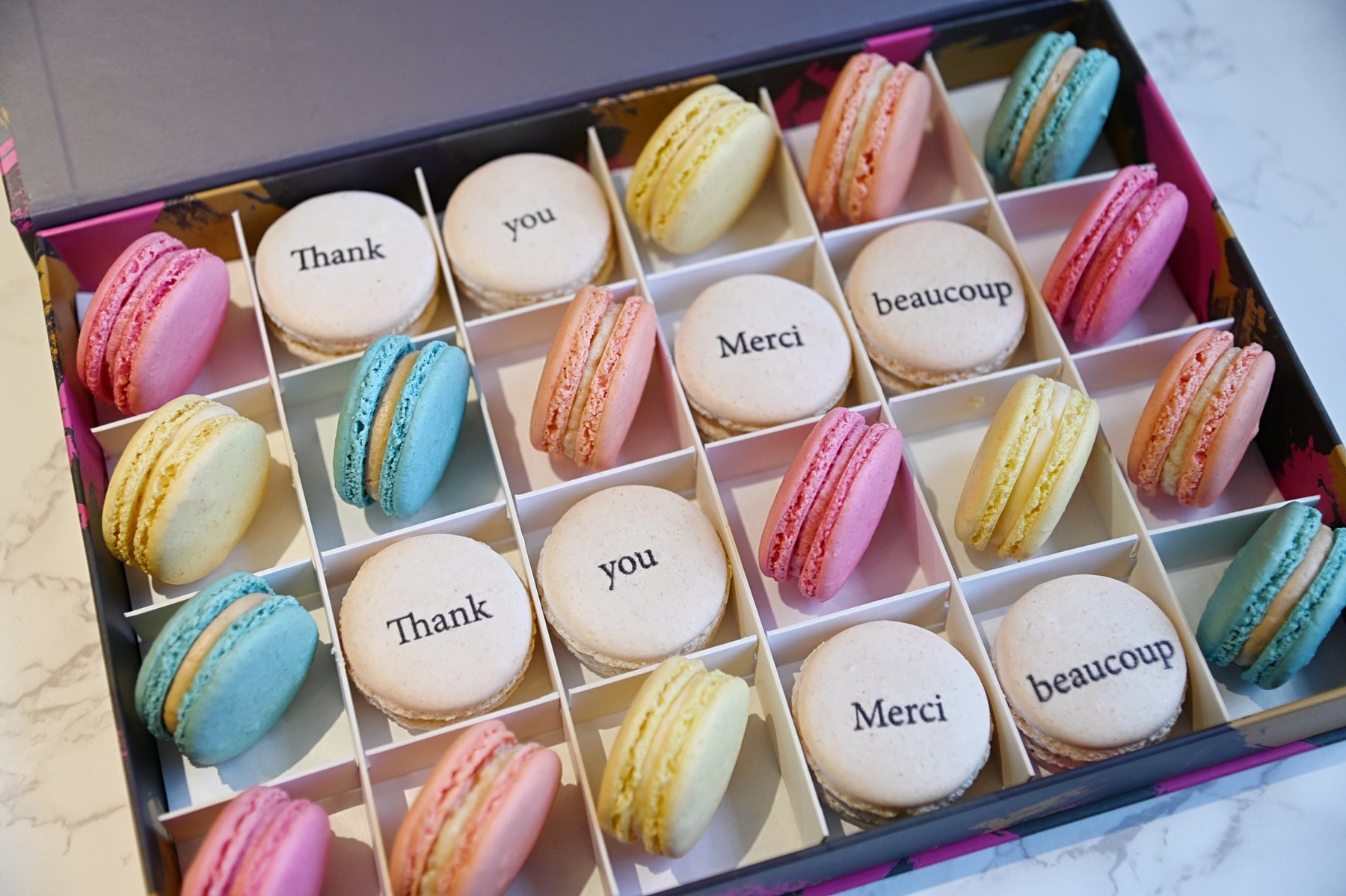 Indulge in our delightful Thank You Macarons Gift Box, featuring a vibrant array of macarons with a sweet "thank you" touch.