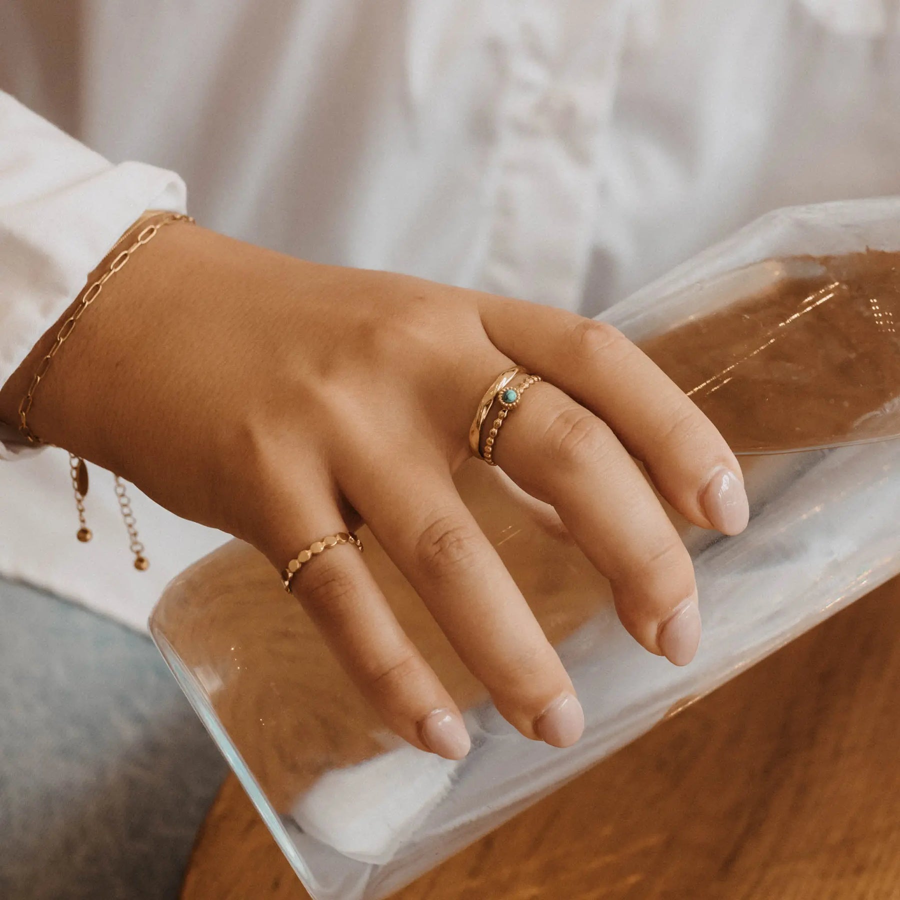 Featuring the Turquoise Stone Double Ring, with its vibrant turquoise stone reminiscent of the ocean’s calming hues, and the Dainty Dot Ring, one of our best-selling designs for its minimal beauty.