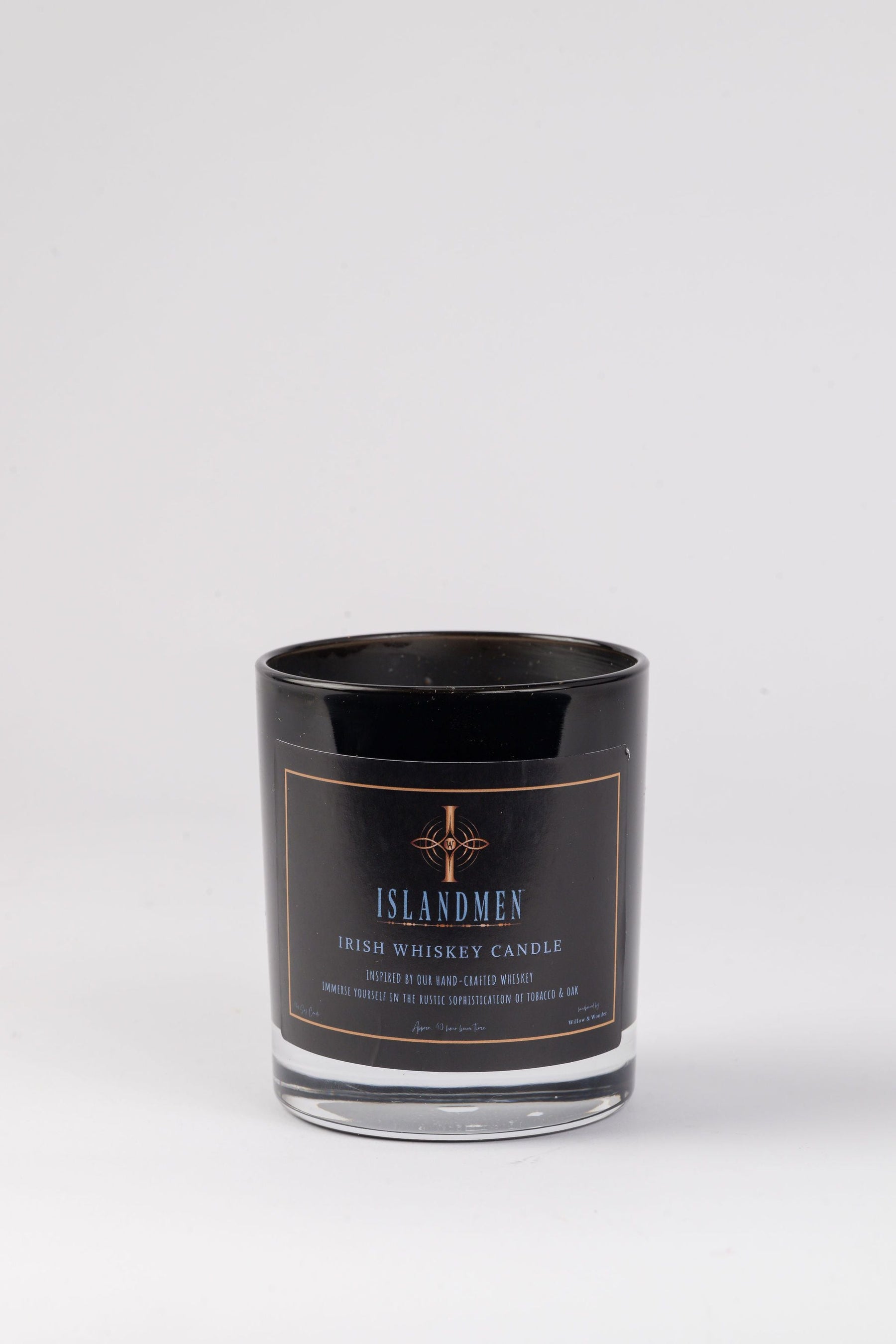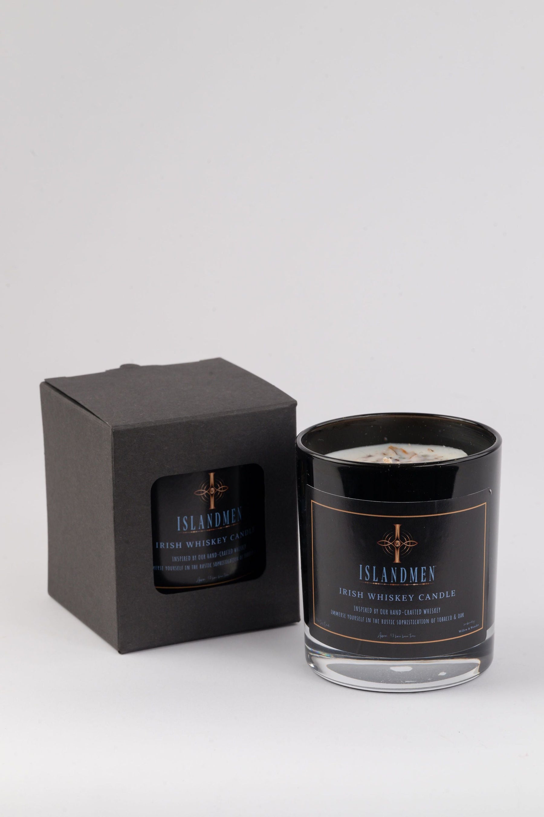 Transport yourself to the world of Irish Whiskey with our IslandMen Candle. Crafted to embody Tobacco & Oak, this hand-poured soy wax candle from 'Willow & Wonder' offers 40 hours of clean burn time. Packaged in a sleek black gift box, it makes a perfect gift for non-drinkers.